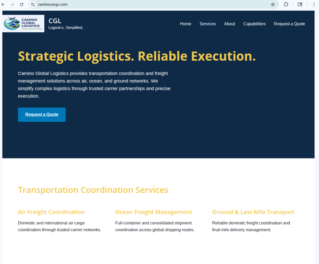 CaminoCargo is a digital logistics platform designed to connect customers with transportation services. The website focuses on streamlined service requests, modern design, and an easy-to-use interface for businesses needing freight and cargo transportation.